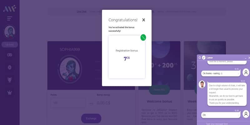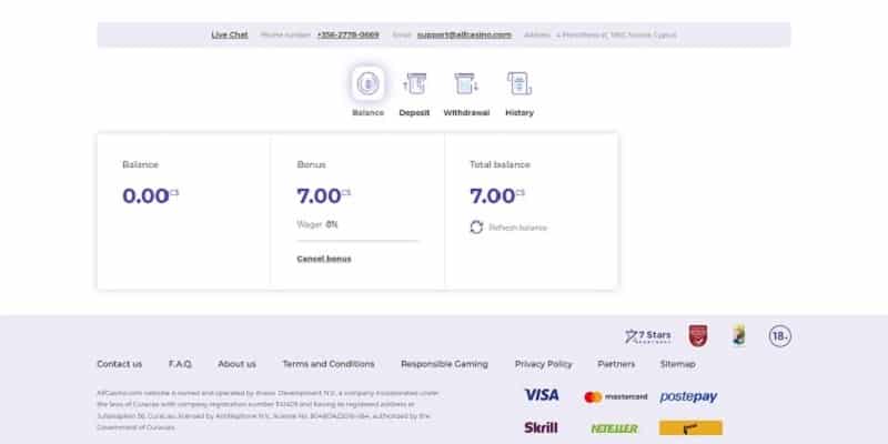 All you need to do is sign up to the casino, which takes a little under a minute. You can then contact support requesting the no deposit bonus and the support team will credit your casino account. Your account will be credited with the currency you chose upon sign up – $7-€5-₹400.