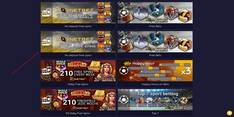 - Go to the ‘Promotions’ page at Hornetbet, click ‘No Deposit Free Spins’ and then ‘To the Free Spins’.