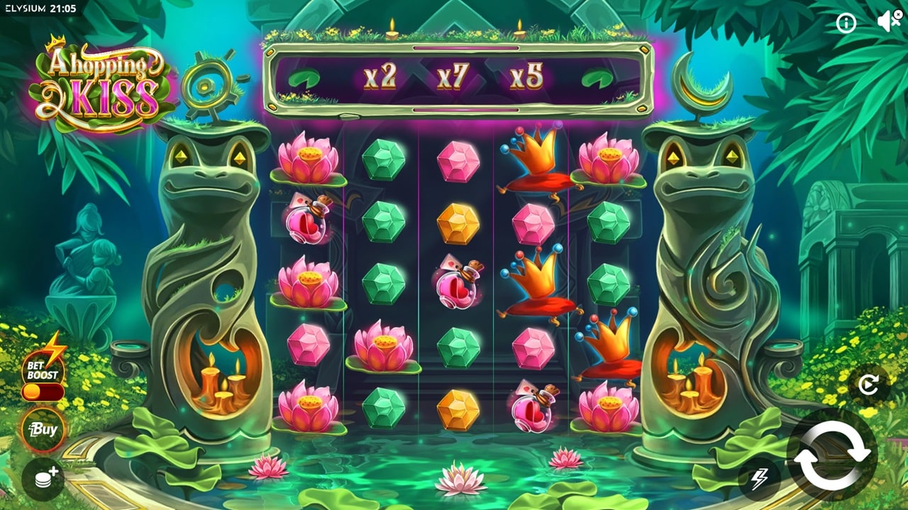 Step into a moonlit pond where enchanted frogs, sparkling gems, and spellbound princesses take the reels by storm. A Hopping Kiss blends fairytale charm with clever bonus mechanics, offering you a game filled with Chasing Wilds, multipliers, respins, and two different Free Spins features.