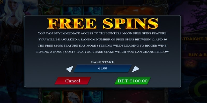 During the bonus feature, you can gain additional spins by having a bonus symbol come up on the bonus reel. Having this will mean that for the next 4 spins, the Hunter will cast her magic and up to 6 rows of that reel will change into a bonus position, and award +1 spin per symbol. When you buy the bonus feature, you will be awarded a random number of free spins to begin the free spins bonus round; up to 36 free spins.